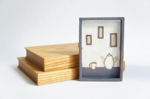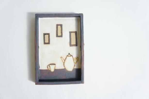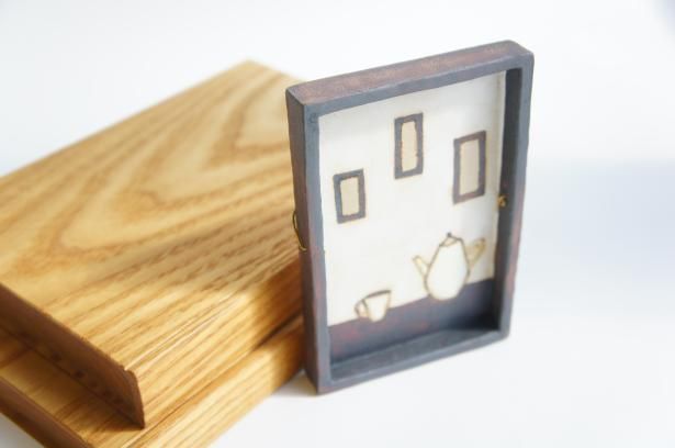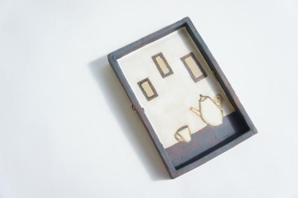 陶板作品:お茶の時間、白い壁と小さな窓のコントラストが愛らしい景色を切り取った一枚の写真のような優しい陶板です。その絵柄は、釉薬によって塗り分けられ、焼き上がりによって唯一無二の一枚となります。裏面に作者サインが施されています。<幅8cm×高さ11.7cm×厚さ1.5cm 裏側に壁掛けワイヤー付>
