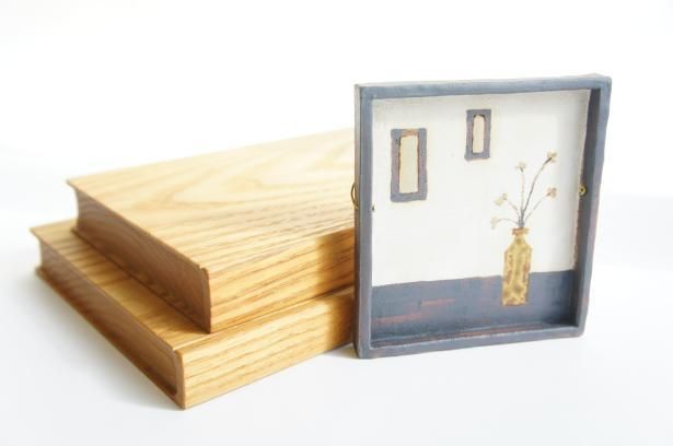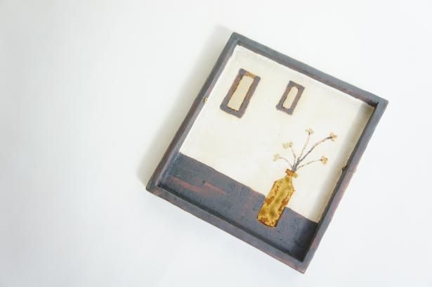 陶板作品:花瓶に生けられた小さな白い花、白い壁と小さな窓のコントラストが愛らしい景色を切り取った一枚の写真のような優しい陶板です。その絵柄は、釉薬によって塗り分けられ、焼き上がりによって唯一無二の一枚となります。裏面に作者サインが施されています。<幅9.5cm×高さ10.4cm×厚さ1.3cm 裏側に壁掛けワイヤー付>