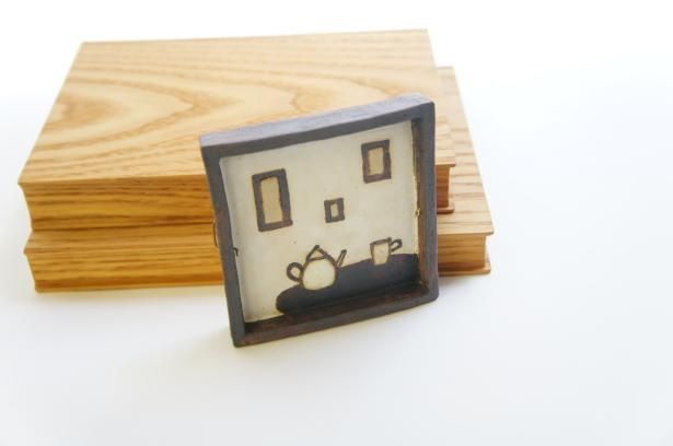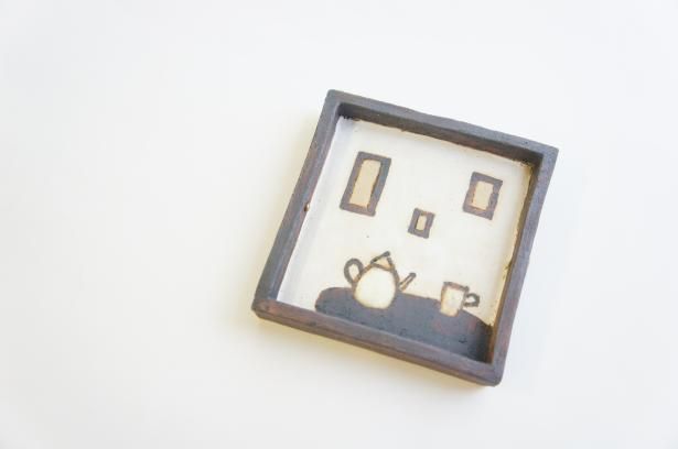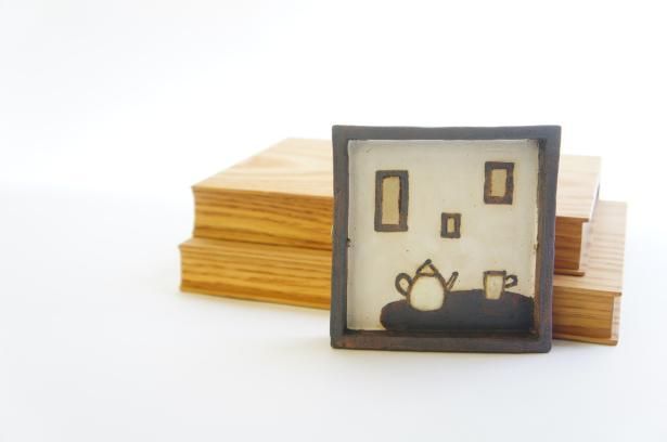 陶板作品:お茶の時間、白い壁と小さな窓のコントラストが愛らしい景色を切り取った一枚の写真のような優しい陶板です。その絵柄は、釉薬によって塗り分けられ、焼き上がりによって唯一無二の一枚となります。裏面に作者サインが施されています。<幅8.3cm×高さ8.7cm×厚さ1.5cm 裏側に壁掛けワイヤー付>