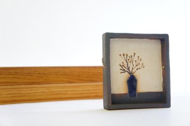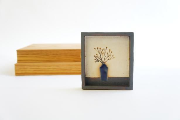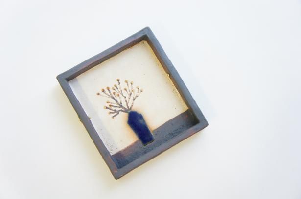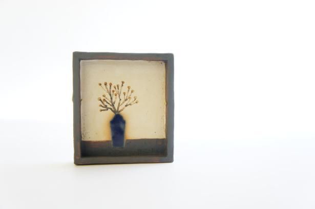 陶板作品:鮮やかな碧い花瓶に生けられた白い花、白い壁と小さな窓のコントラストが愛らしい景色を切り取った一枚の写真のような優しい陶板です。その絵柄は、釉薬によって塗り分けられ、焼き上がりによって唯一無二の一枚となります。裏面に作者サインが施されています。<幅7.5cm×高さ8.2cm×厚さ1.5cm 裏側に壁掛けワイヤー付>