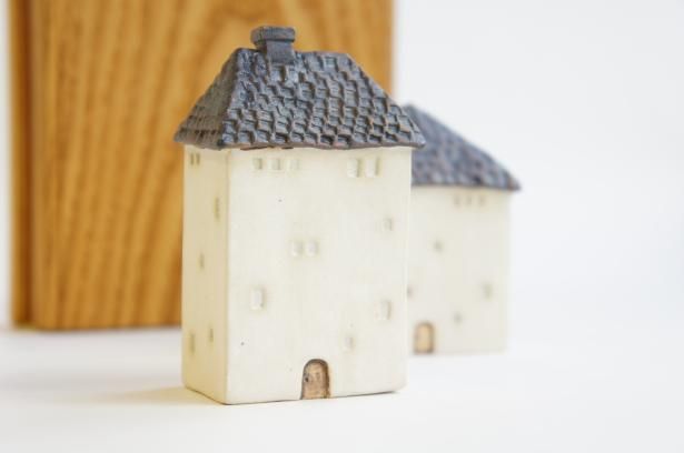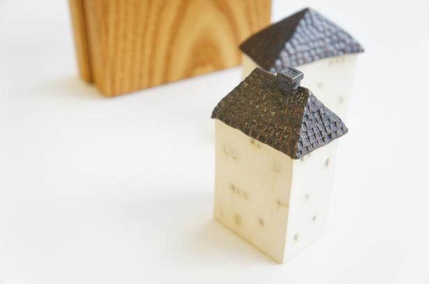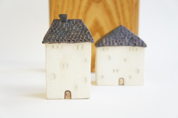 城田作品の代表作、家。白い壁に黒い屋根、小さな窓と煙突が織りなす建築には、どんな人が住んでいるのでしょう。<幅5.5cm×高さ9cm×厚さ3.7cm>