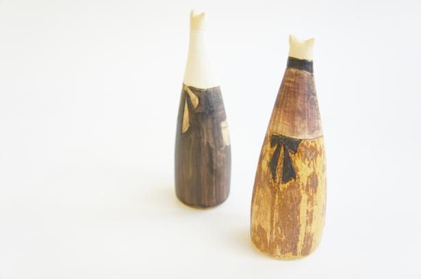 黒い襟のシャツに愛らしい黄色いエプロンを着けた lady cat。小さなその顔は愛おしい子猫のよう。<幅4.3cm×高さ13.3cm×厚さ4.3cm>